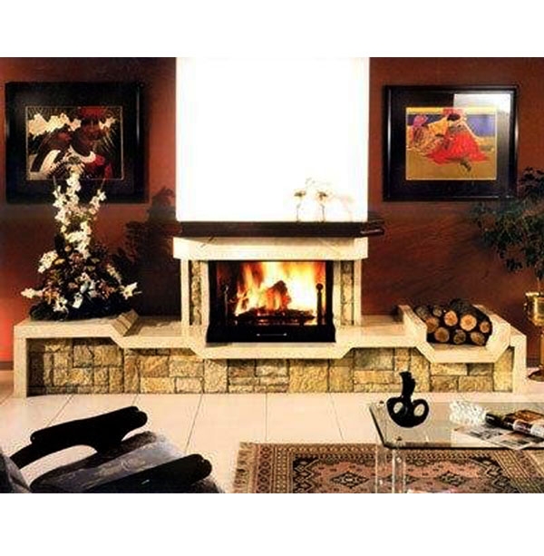 Фронтальный камин из камня Serol без шва. Плита, канты и консоль из полированного мрамора Crema Marfil. Формированная деревянная балка толщиной 10 см. Металлическая топка открыта по бокам.