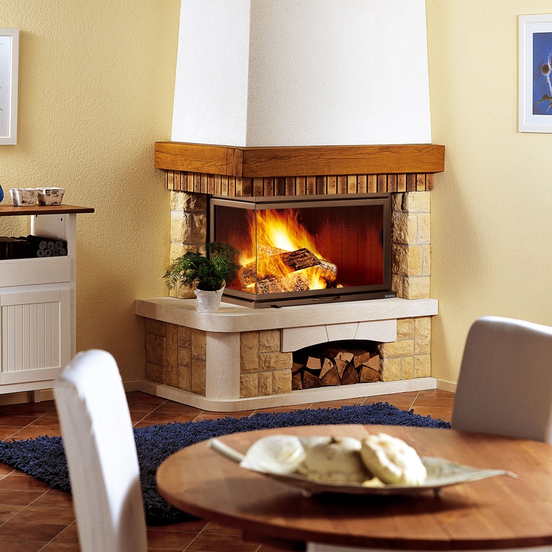 Пристенно-угловой камин Richard Le Droff Anthaide. Представлена модель из камня "Бут Средиземноморский" и камня "Provence", балка из дуба, с топкой серии 2500.