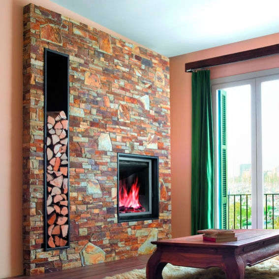 Пристенный камин из натурального камня и плитки из кварцита без шва. Вертикальный металический дровник черного цвета. Панорамная топка Double 65 с гильотиной.