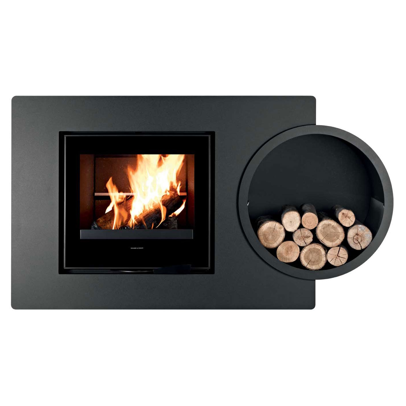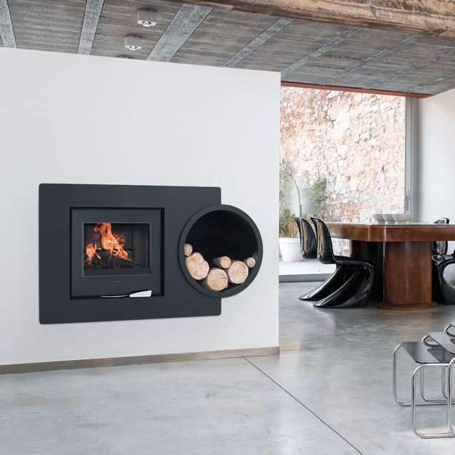 Модель из стали черного или белого цвета. Под топку Palatium 3. Удобная черная дровница, встроенная в боковой части камина.