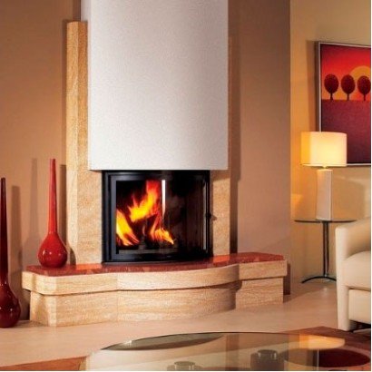 Полувстроенный камин. Изготовлен из камня Castillon + красный "Rocmarble" Corallin.