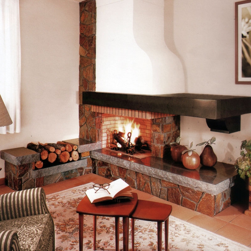 Угловой камин из сланца Nicorella неправильной формы с цементным швом. Плита из полированного камня San Vicente неровный кант. Консоль из огнеупорного кирпича толщиной 5 см. Быки и балка из Iroko. Кирпичная топка, открытая сбоку, банкетка и колонна.