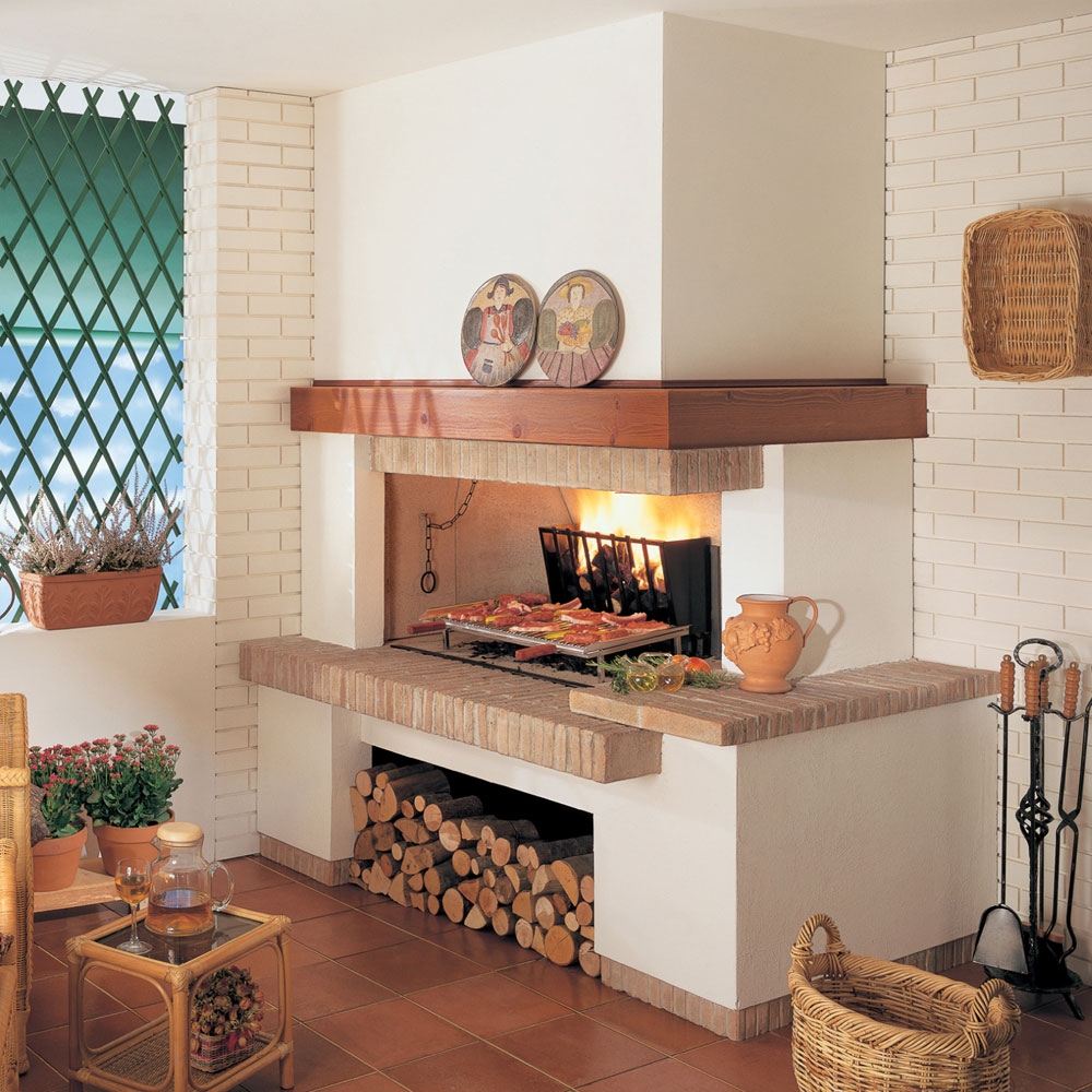Облицовка из неокрашенного материала со столешницей из рустикальных кирпичей. Полка – ель. Доступен вариант со столешницей из мрамора Rosso Verona по той же цене.