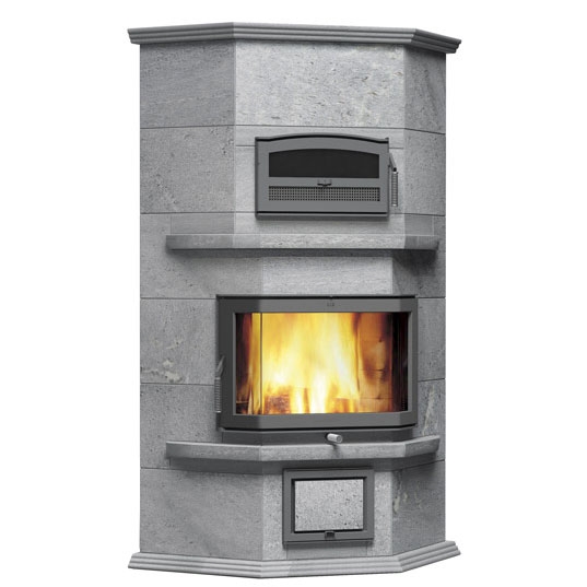 Угловой печь-камин с задним нижним подключением 2 теплового класса, для больших помещений. С духовкой.