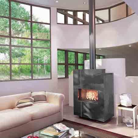 Металлическая отопительная печь-камин. Ввод наружнего/первичного воздуха. Облицовка для топки из нержавеющей стали. Вертикальная полоска-инкрустация из нержавеющей стали. Поднимающаяся и открывающаяся классическим способом дверца.