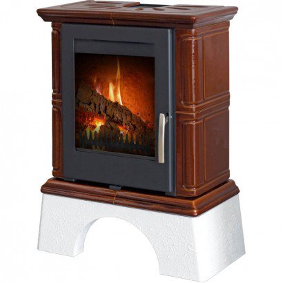 Отопительная печь имеет с неподражаемый и очень интересный дизайн. Большая и просторная топка заключена в керамическую облицовку, которая расположена на конусообразной подставке. Керамическая облицовка модели это печи исполнена в разных вариантах.