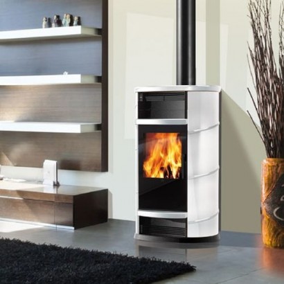Дровяная печь с боковыми элементами, крышкой и вставками из керамики с узором "спираль", обклад Ecokeram, колосник - чугун, дверца - из затемненного стекла с шелкографией. Верхнее и заднее подключение к дымоходу. Печь выполнена из чугуна.