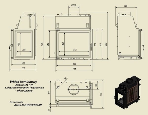 Топка с водяным контуром AMELIA/PW/BP/24/W/Z, стекло слева, змеевик