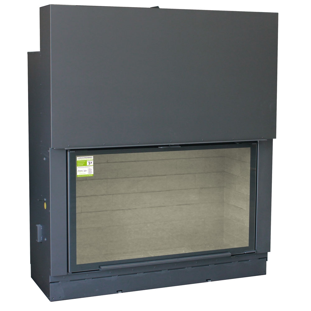 Фронтальная каминная топка черного цвета. Внутренняя отделка - кирпичи серого цвета. С системой полного сгорания RT.