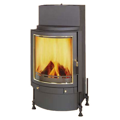 Полукруглое стекло, футеровка - шамот, боковое открытие, рамка дверцы золотая. Подача воздуха на горение извне.