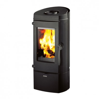 Черная чугунная печь с закругленными сторонами. Внутренний обклад "медовые соты". Вертикальная загрузка дров. Дрова до 33 см.
