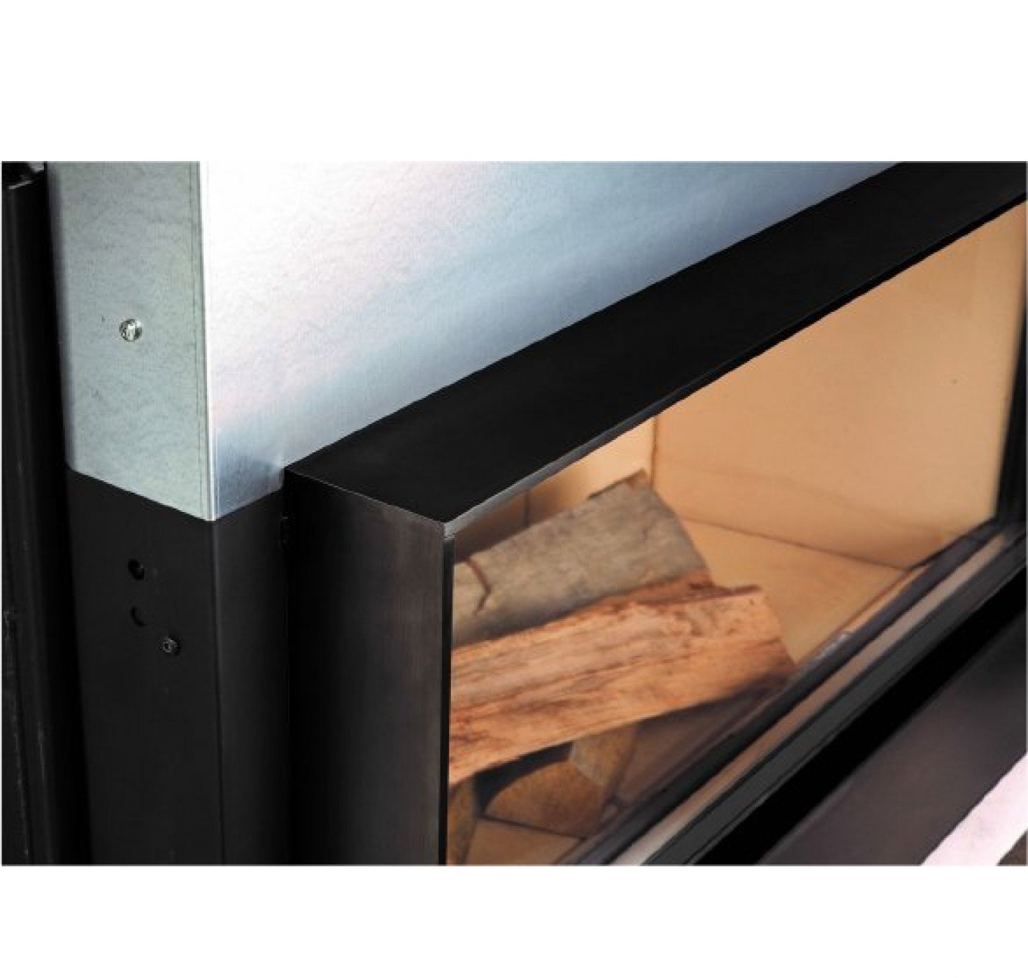Каминная топка с прямым стеклом. Уменьшенная монтажная глубина. Топочная камера футерована шамотом. Подъёмный механизм двери (система Easy-Lift). Ширина дверки 876 мм. Высота дверки 389 мм. Возможно подключение воздуха извне.