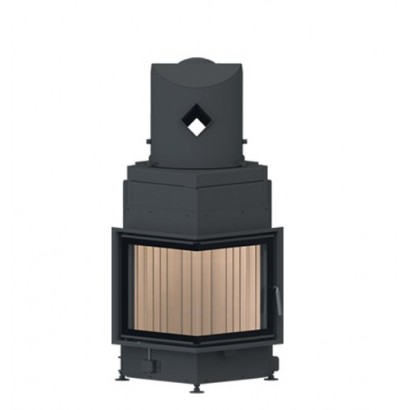 Угловая каминная топка с Г-образным стеклом. Топочная камера футерована шамотом. Ширина дверки 506+506 мм. Высота дверки 485 мм. Возможно подключение воздуха извне.