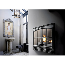 Каминная топка с прямым стеклом. Топочная камера футерована шамотом. Подъёмный механизм двери (система Easy-Lift). Ширина дверки 851 мм. Высота дверки 502 мм. Возможно подключение воздуха извне.
