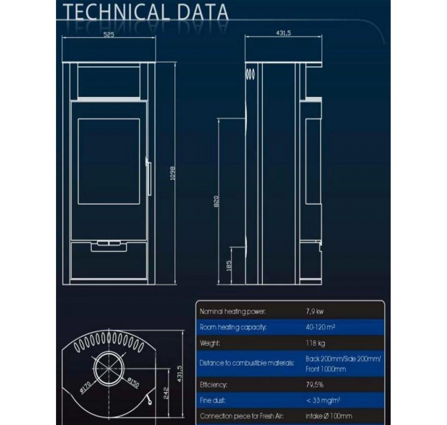 - Диаметр дымохода, (мм) 150 мм.