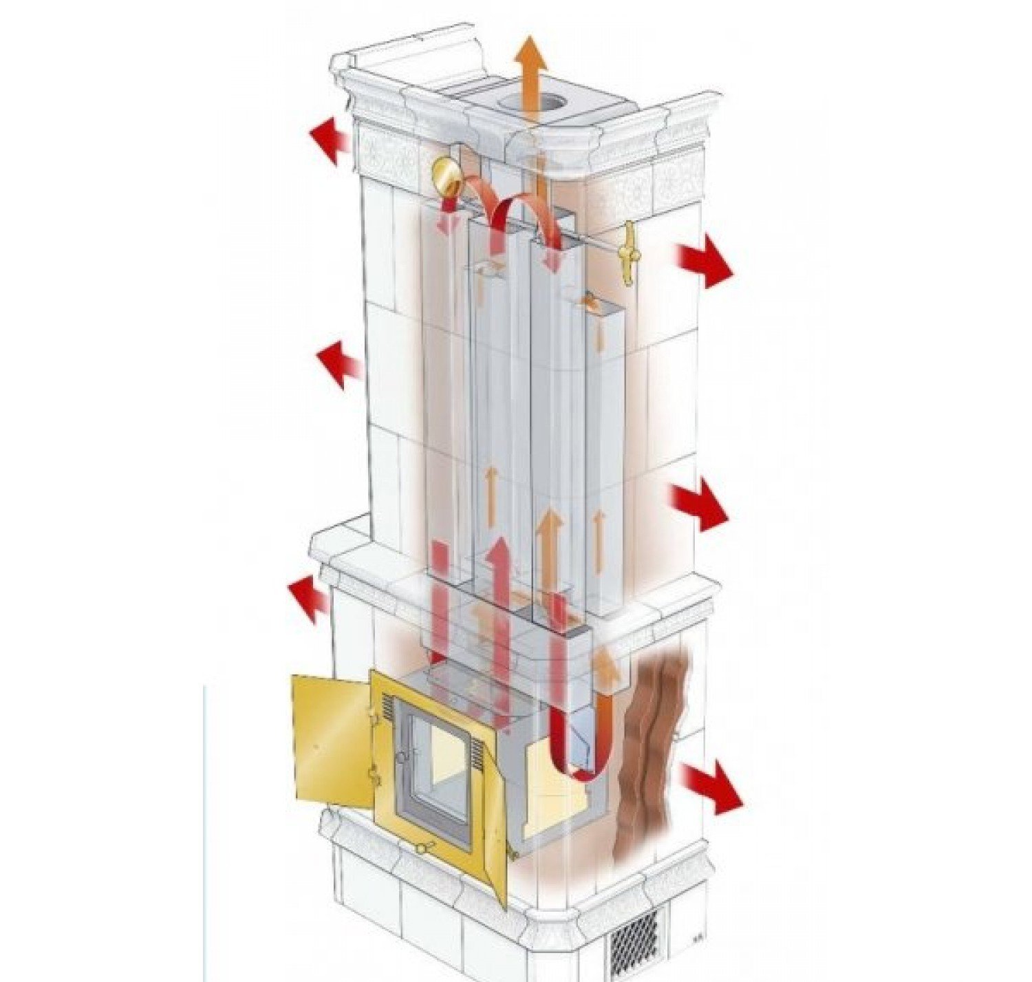 Печи оборудуются уникальной секцией горячего воздуха с выводом тепла на фронтальную сторону печи, что ускоряет нагрев помещения. Секция горячего воздуха может дополняться вентилятором, который равномерно распределяет тепло по помещениям. В доме с принудительной вентиляцией рекомендуется подключать канал подвода воздуха снаружи напрямую к печи.