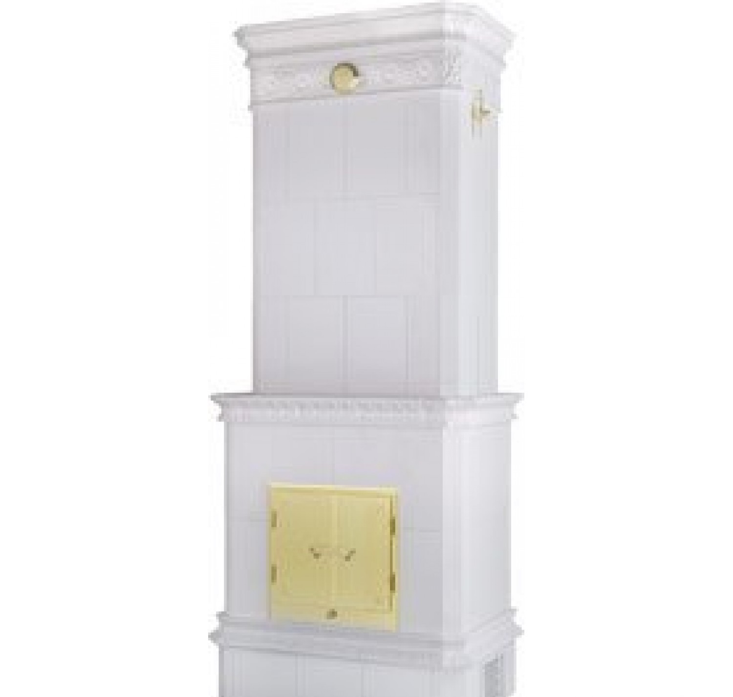 Орнамент, украшающий верхнюю плитку, полочку и плинтусы этой гладкой печи, вдохновлён мотивами античности.