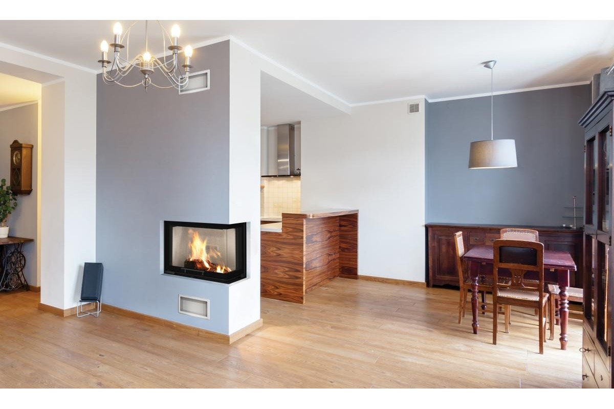 Угловая каминная топка BeF Therm V 8 CP с Г-образной формой дверцы и подъемом – это европейская современная модель предназначенная для работы на сухих дровах лиственных пород дерева или брикетах.
