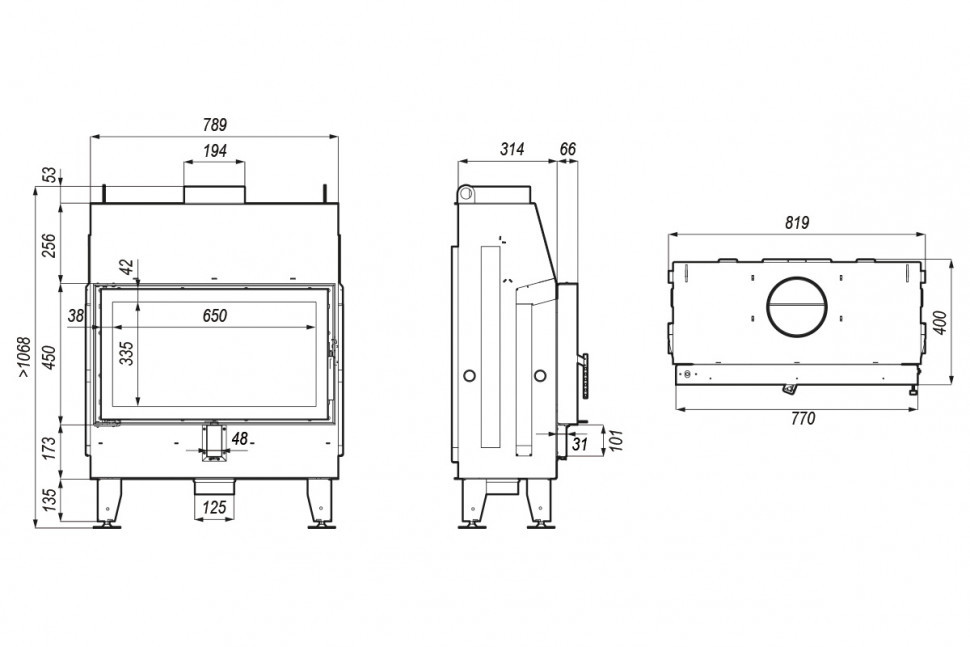 Топка оборудована закаленным стеклом, стойким к высоким температурам (до 800 °С). Вставка изготовлена из высококачественной стали, имеет энергоэффективность ― класс A и отапливает помещения площадью 45-145 м². Модель дополняется стальной декоративной рамкой, которая приобретается отдельно.
