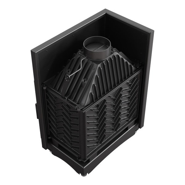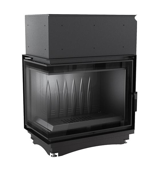 • Угловая топка с цельным Г-образным стеклом. Дверца топки распашная.