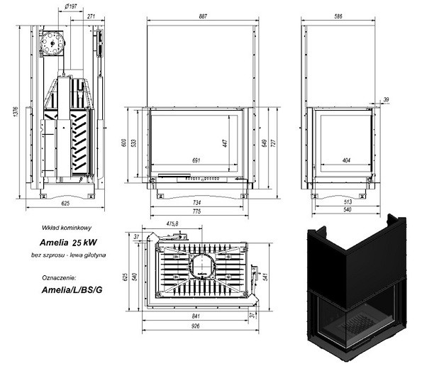 Каминная топка Kratki Amelia/L/BS/G (Г-образное стекло слева, гильотина) – топочная камера или топка-вкладыш, предназначенная для отопления дома площадью до 250 кв.м. Представленная модель – это угловая топка со стеклом с левой стороны с вертикальным подъёмом дверцы. Топка серии Amelia работает на недорогом топливе, поэтому может служить источником тепла в загородном доме или коттедже, а также выполнять декоративную роль, украшая и создавая неповторимый облик помещению, в котором она расположена.