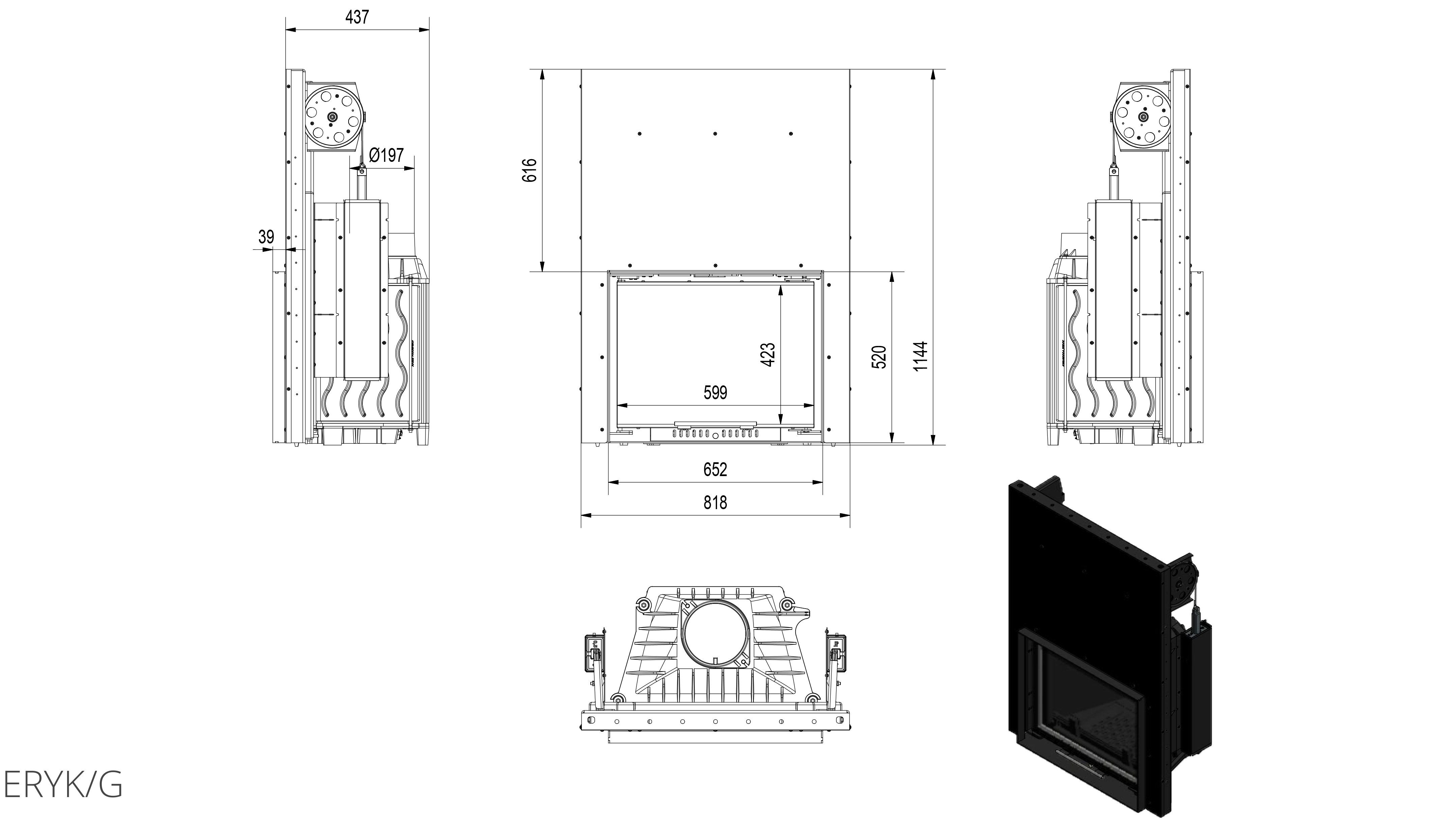 Чугунная каминная топка Kratki Eryk/G (гильотина) с прямым жаропрочным стеклокерамическим остеклением, произведенным немецкой компанией ShottRobax, и большой топочной камерой. Длительность горения одной закладки дров контролируется благодаря регулятору подачи воздуха. Дверца данной модели оснащена подъемным механизмом открывания с противовесом. Для чистки стекла от сажи дверца откидывается на угол 45°.
