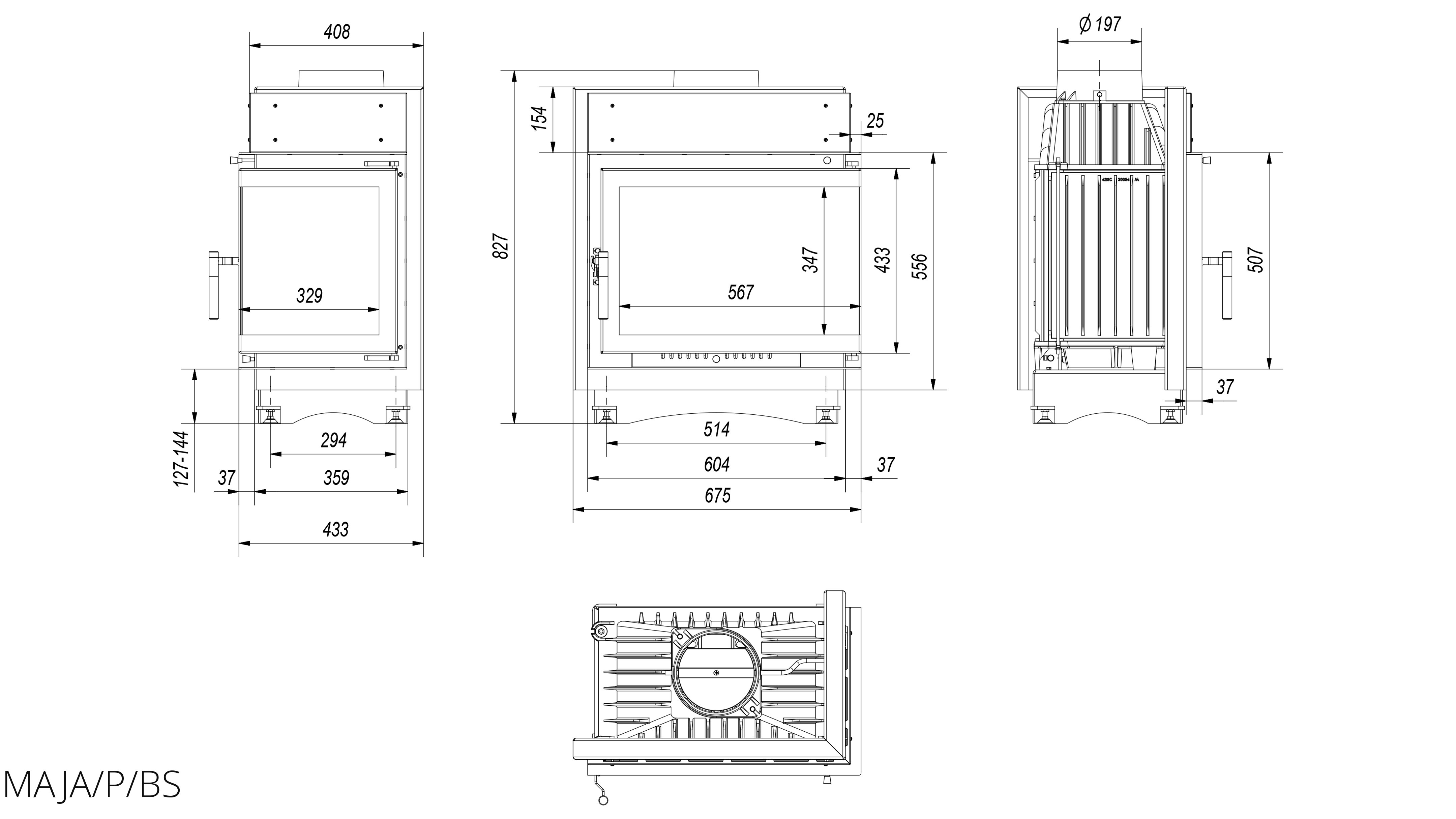 Модель Maja/P/BS имеет угловое стекло, расположенное с правой стороны, представляющее прекрасный обзор и в тоже время защищающее помещение от попадания искр. На фронтальной части топки расположены ручки, с помощью которых можно регулировать подачу воздуха для горения и открытие шиберной заслонки.