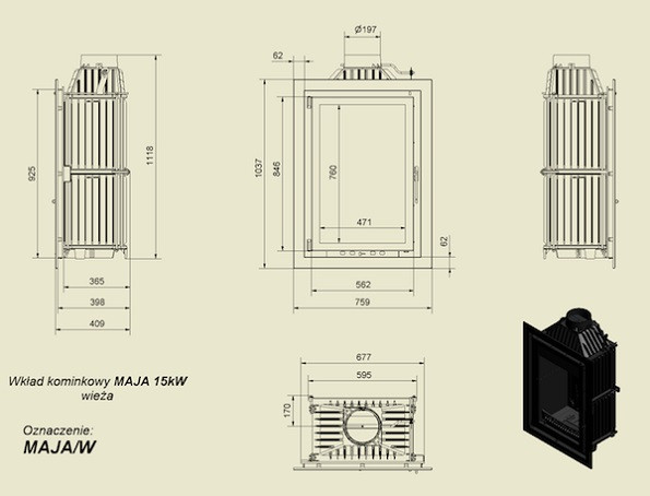 Каминная топка Kratki Maja Wieza – это чугунная топка вертикального типа, ширина её стекла составляет всего 470 мм, поэтому такую топку можно разместить в ограниченном пространстве, например, в угловом камине.