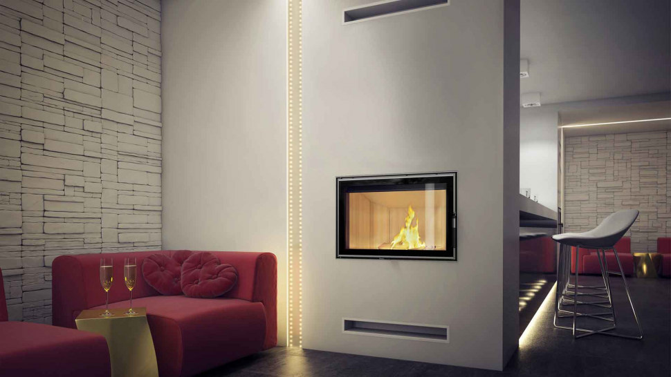 - Кроме того, для топки используется система чистого стекла (воздушная завеса), то есть воздух подается прямо на стекло через систему каналов, расположенных по бокам камина. Таким образом, кислород поступает в верхнюю часть камеры сгорания, где происходит сгорание газов, возникших в процессе сжигания дров, что дополнительно уменьшает выброс вредного СО в атмосферу.