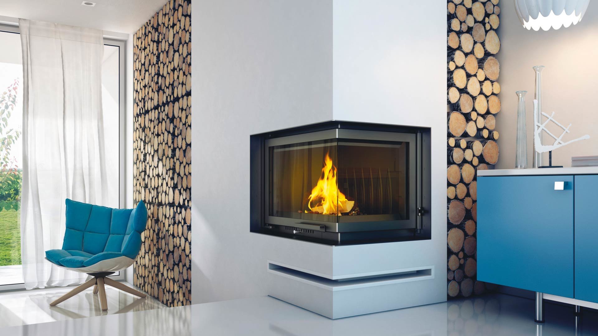 • Каминная топка с двумя стеклянными панелями, сопоставленными друг напротив друга под прямым углом (стеклянные панели соединены без рамы).