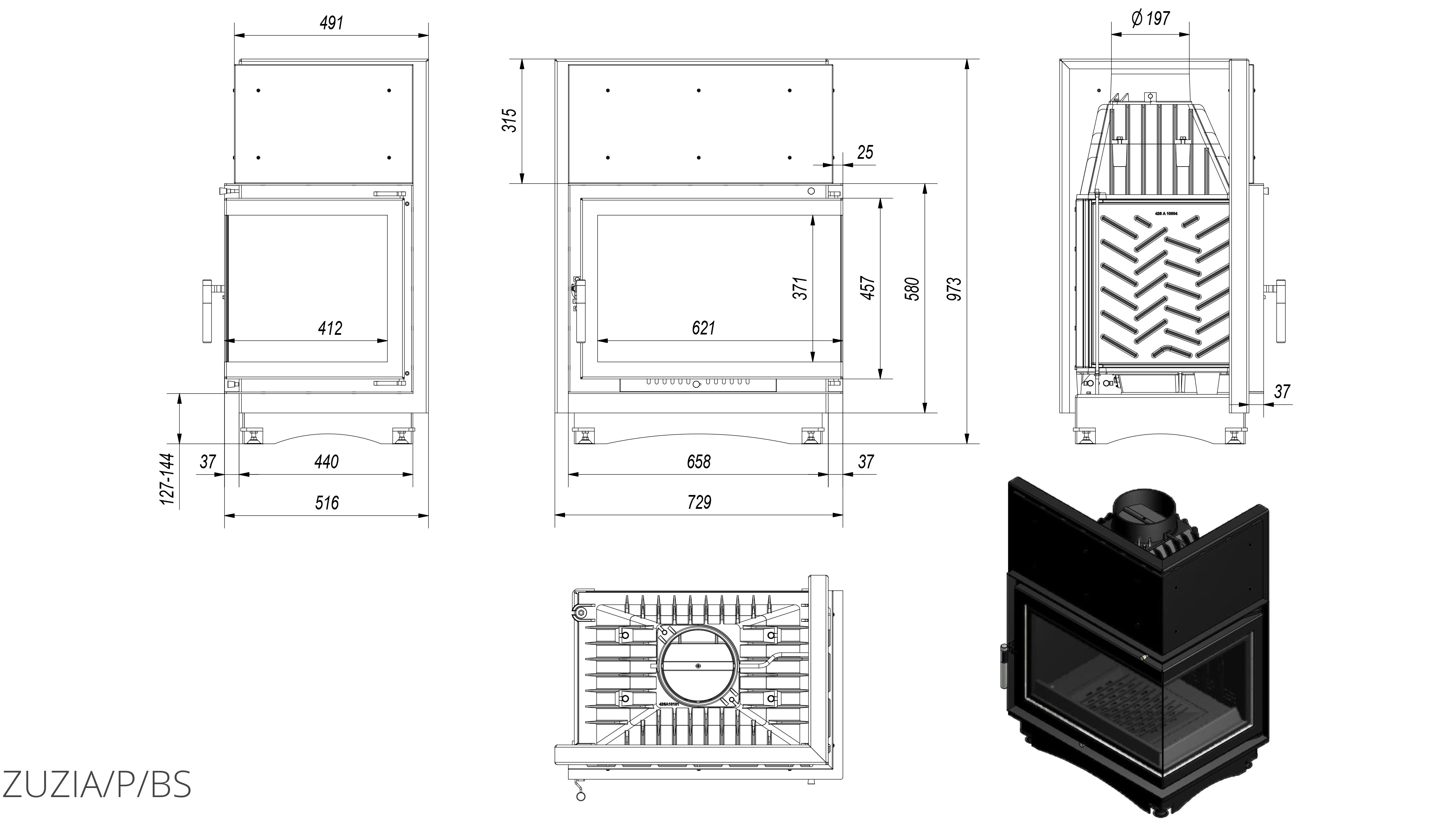 Zuzia/P/BS (Г-образное стекло справа) – популярная серия встраиваемых каминных топок польского производителя Kratki. Топка-вкладыш с угловым стеклом, которая идеально подойдет для установки в пристенном камине. У данной модели Г-образная стеклянная дверца расположена с левой стороны. Zuzia/P/BS – это чугунная топка польского производства с высоким дымосборником, хорошим КПД и прекрасным обзором.