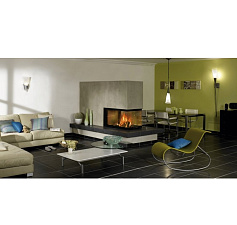 Каминная топка Spartherm Arte U-70h 4s обладает эффектом театрального пространства, когда с первого плана сквозь стеклянный фасад топки виден второй план помещения.
