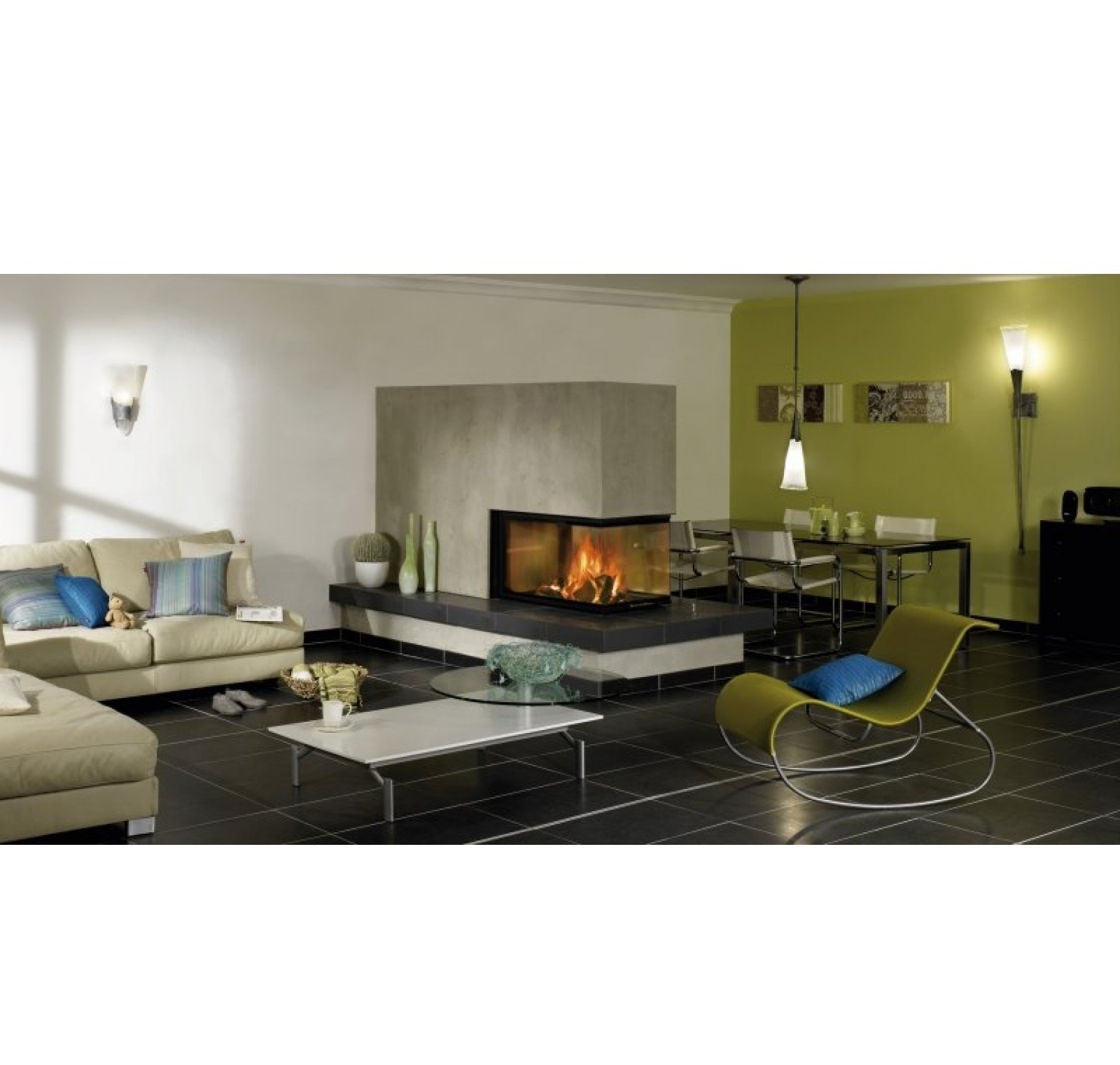 Каминная топка Spartherm Arte U-90h 4s имеет эффект театрального пространства, позволяя с первого плана через огромный стеклянный фасад топки увидеть второй план жилого пространства.