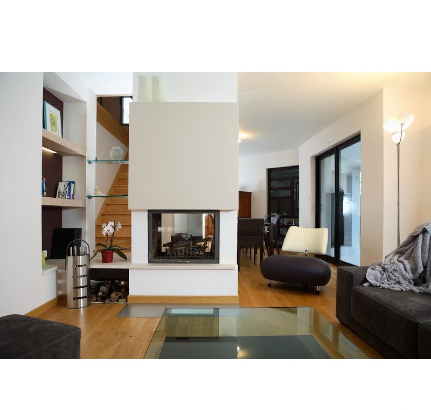 Классическая закрытая двухсторонняя каминная топка с двумя открывающимися дверцами. Топка футерована шамотным кирпичом. Эта разделяющая топка предназначена для установки непосредственно в стене.