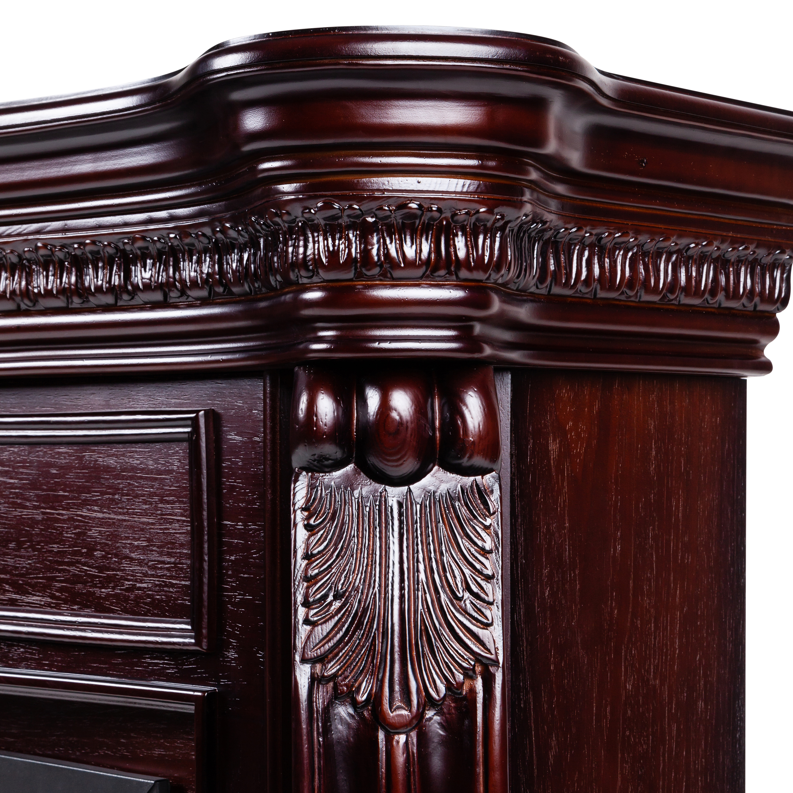 - Обрамление из МДФ и тонированного шпона. Украшен декоративными резными элементами по всей поверхности.
