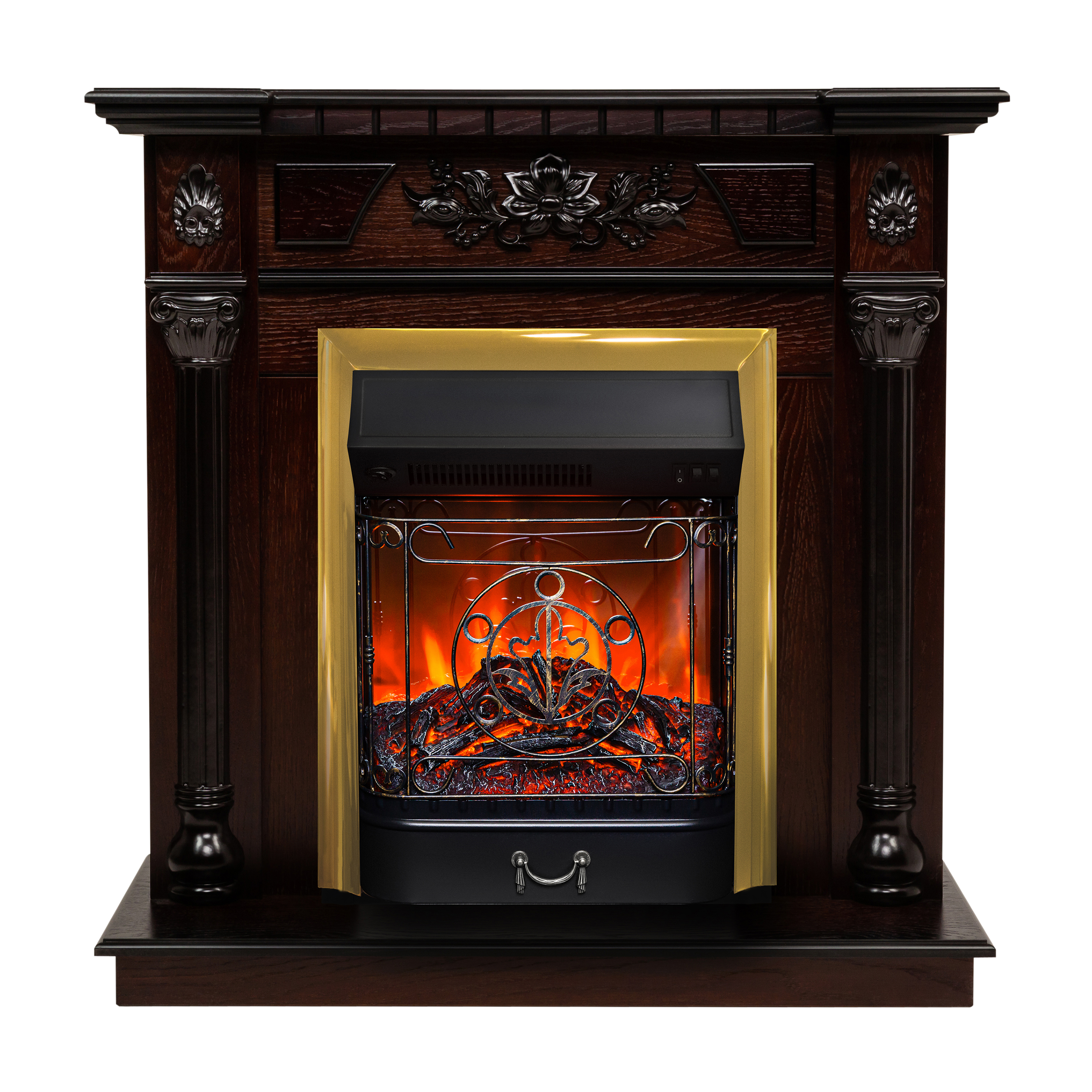 - Портал камина изготовлен из МДФ и покрыт натуральным шпоном дуба. По бокам лицевой части портала установлены две античные полуколонны, на которые опирается каминная полка, украшенная по карнизу геометрической резьбой. На верхней панели, под каминной полкой, установлен классический травяной орнамент и фигурные тяги.