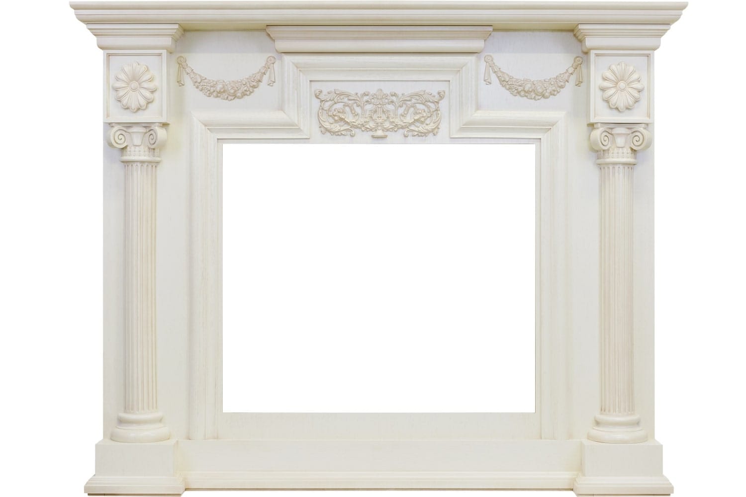 Обрамление для камина сделано из высококачественных материалов. Резной декор украшает фронтальную поверхность портала, а зона очага обрамляется изящными колоннами.