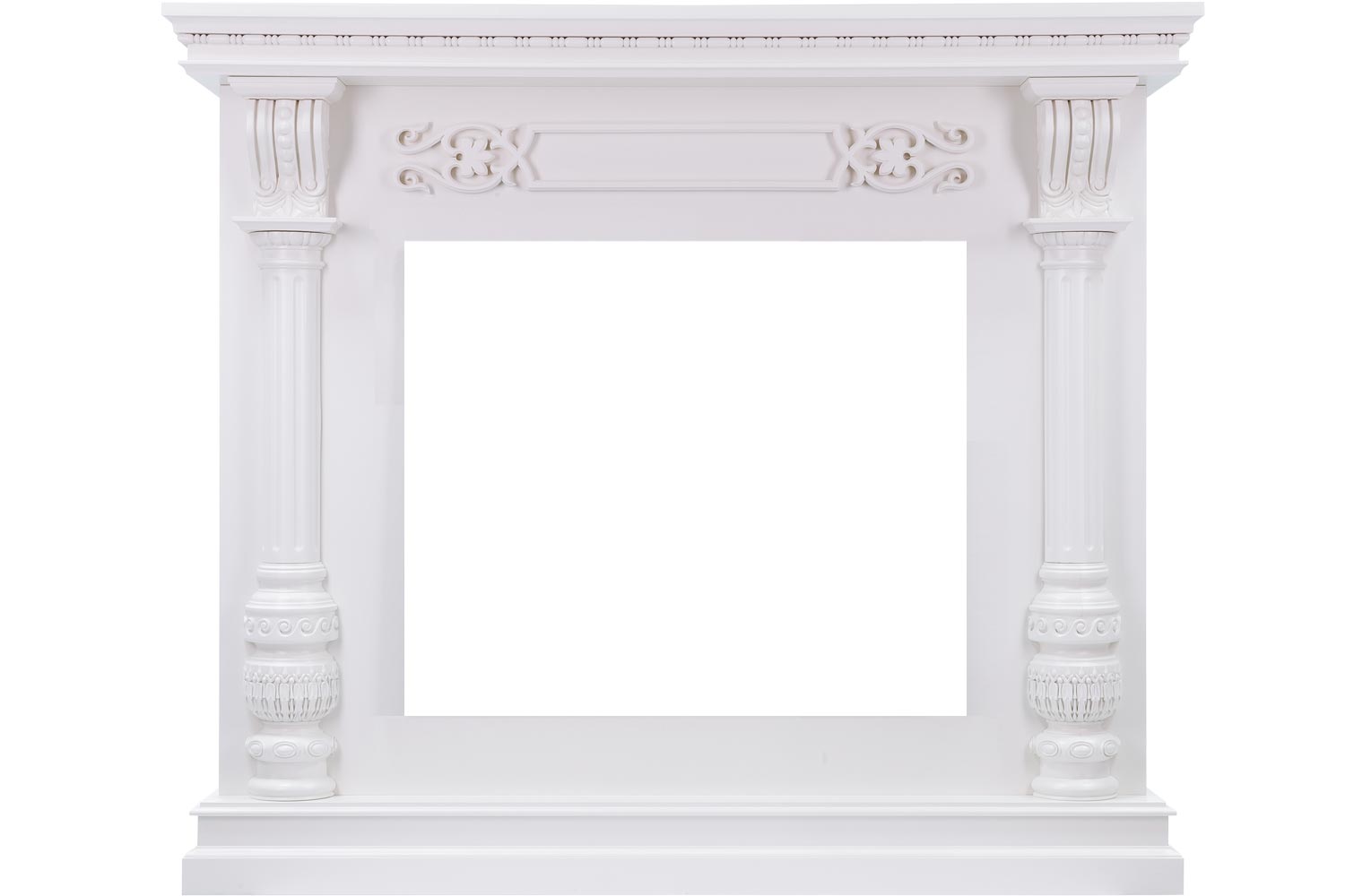 Обрамление для камина сделано из высококачественных материалов. Резной декор украшает фронтальную поверхность портала, а зона очага обрамляется изящными колоннами.