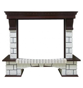 Модель представлена в нескольких вариантах, различающихся как по принципу установки (угловой или пристенный), так и цветовым решением облицовочного камня и деревянных элементов. Декорирована резными вставками в античном стиле.