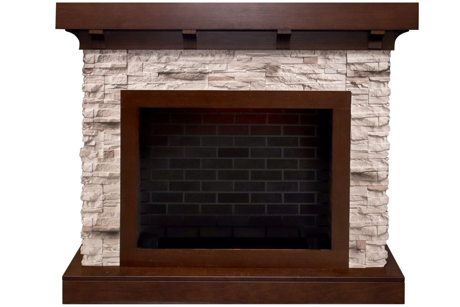 Портал выполнен из дерева и искусственного камня. Широкий постамент делает небольшую модель визуально более представительной. Фронтальная часть обрамления сделана без дополнительного декора в стиле кантри. Эта модель будет органично смотреться в классическом интерьере или в доме в стиле шале.