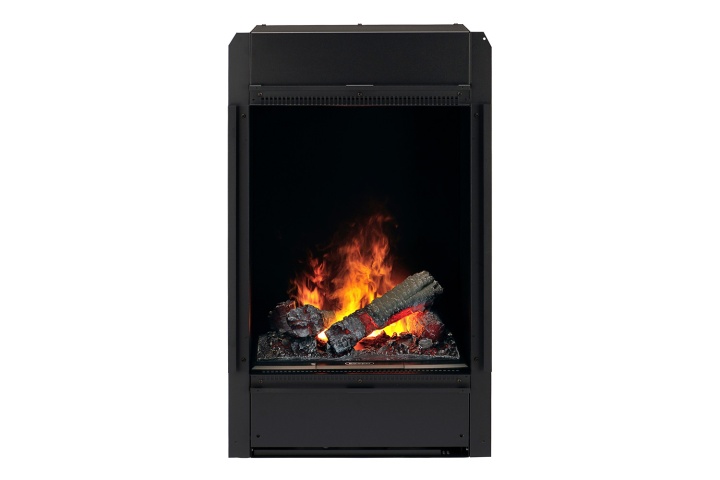 Дрова, охваченные огнем, прекрасно дополняет дизайн камина. Узкий вытянутый корпус черного цвета смотрится элегантно и подчеркивает красоту безудержного ярко-оранжевого пламени.