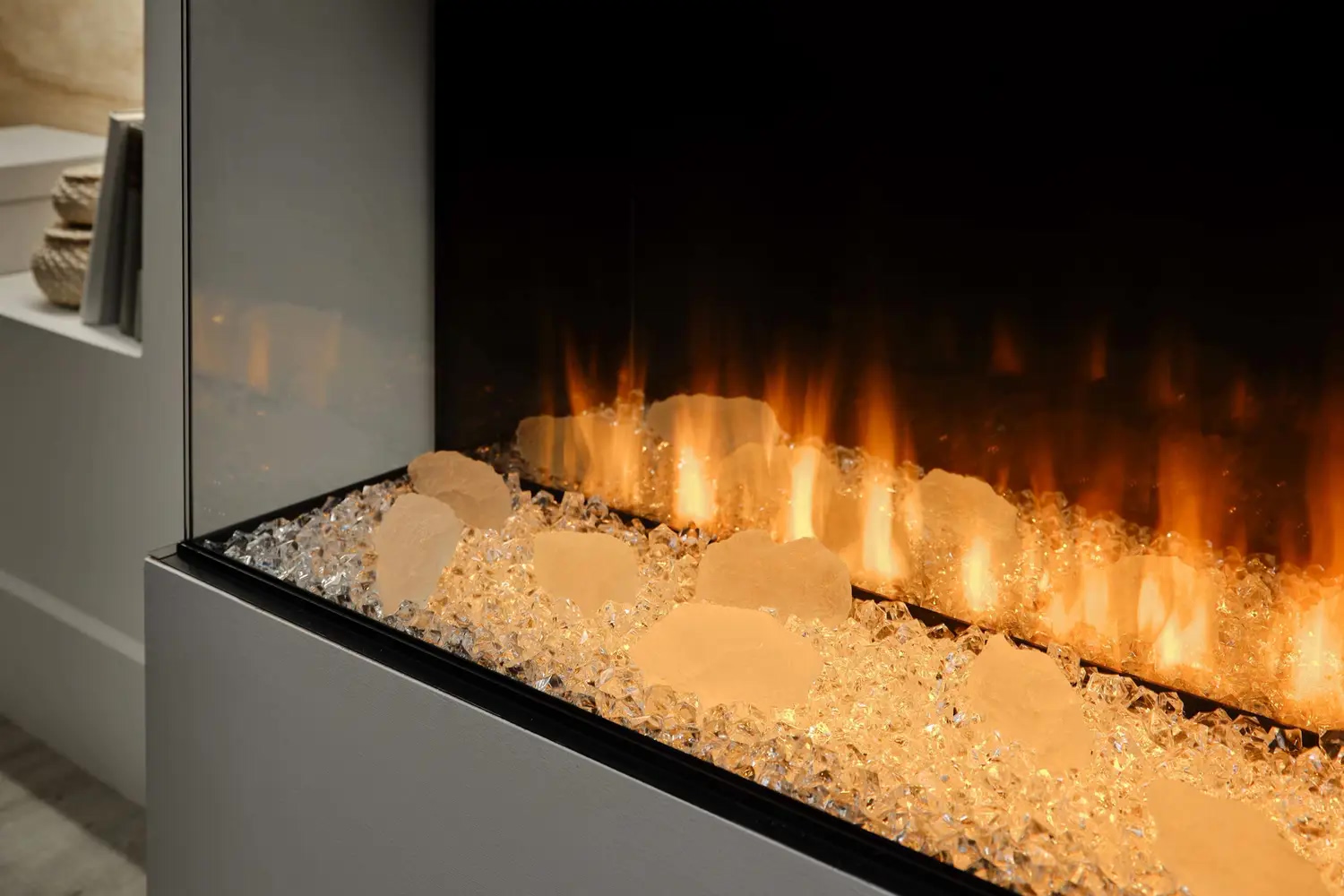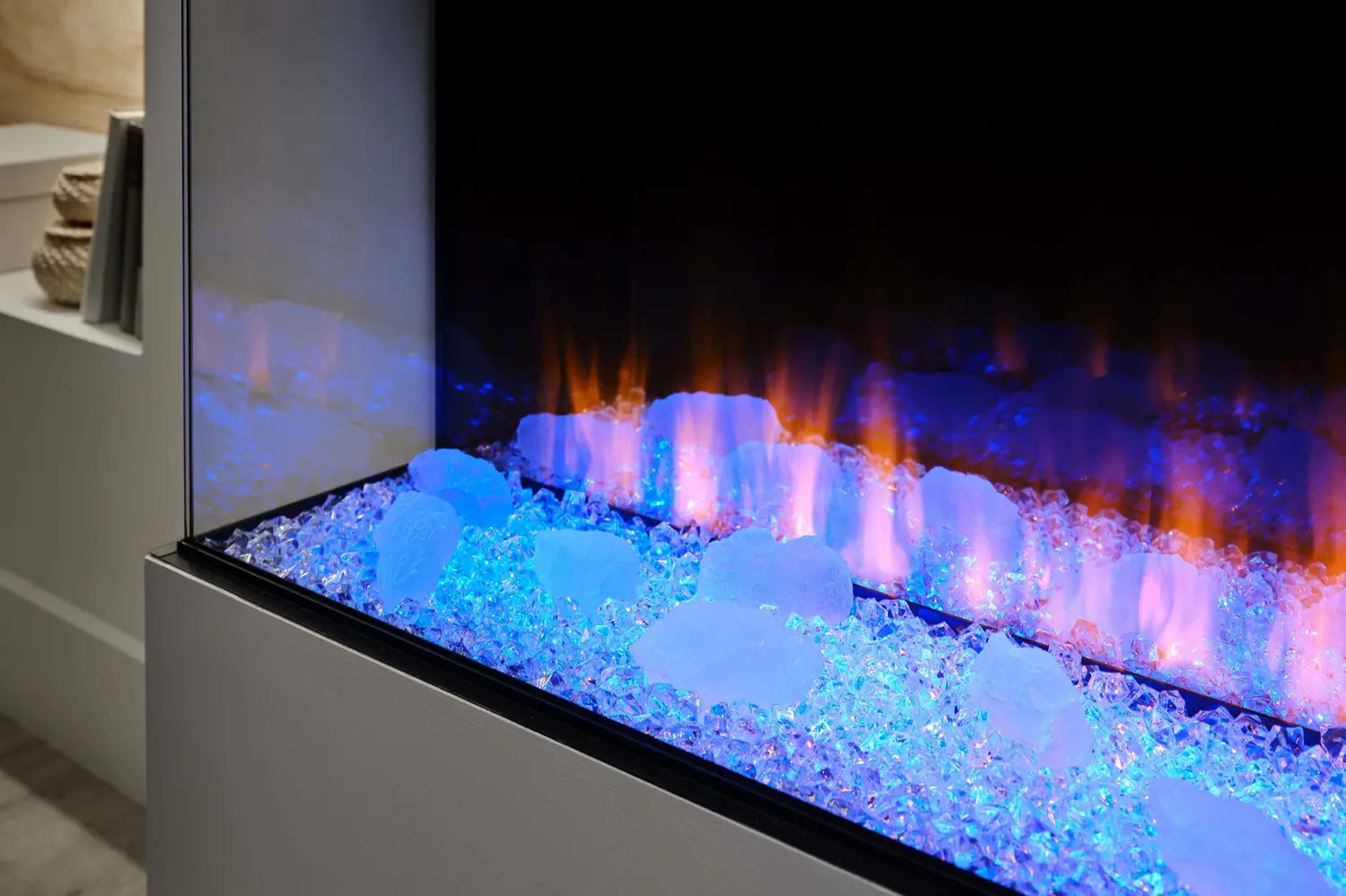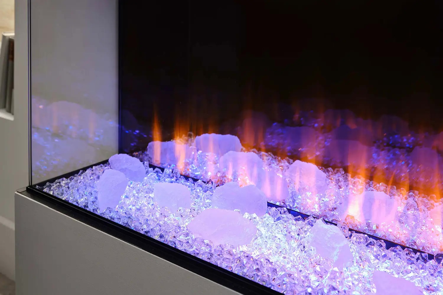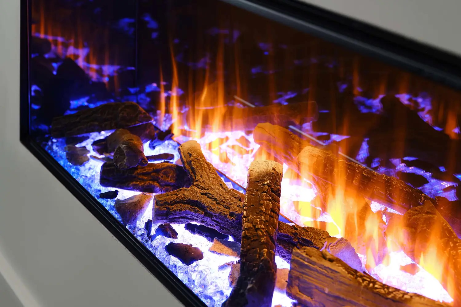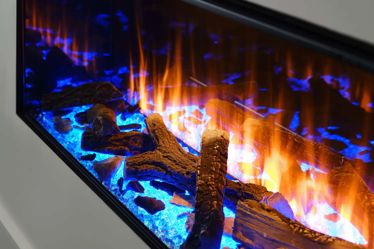 • Функция верхней подсветки: Освещает декоративные элементы (дрова и кристаллы), создавая отражение на задней зеркальной стенке, что усиливает визуальную глубину топки.
