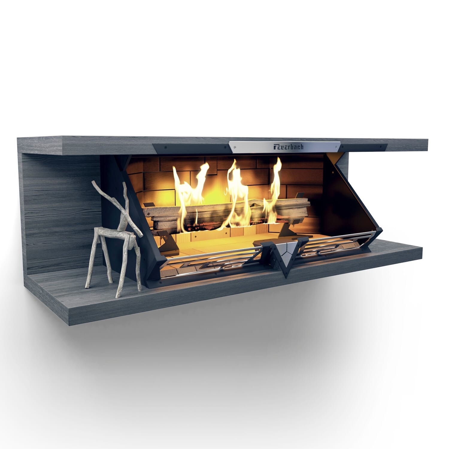 Для обеспечения оптимальных габаритов в случае углового монтажа предусматривается возможность изменения конфигурации топки FEUERBACH Type. Конфигурация изменяется путем переноса модулей электроники/электрики с боковых стенок корпуса на заднюю стенку, обеспечивая максимальный диапазон дизайнерских решений. Таким образом доступны два варианта фронтальное и угловое исполнение данной модели.